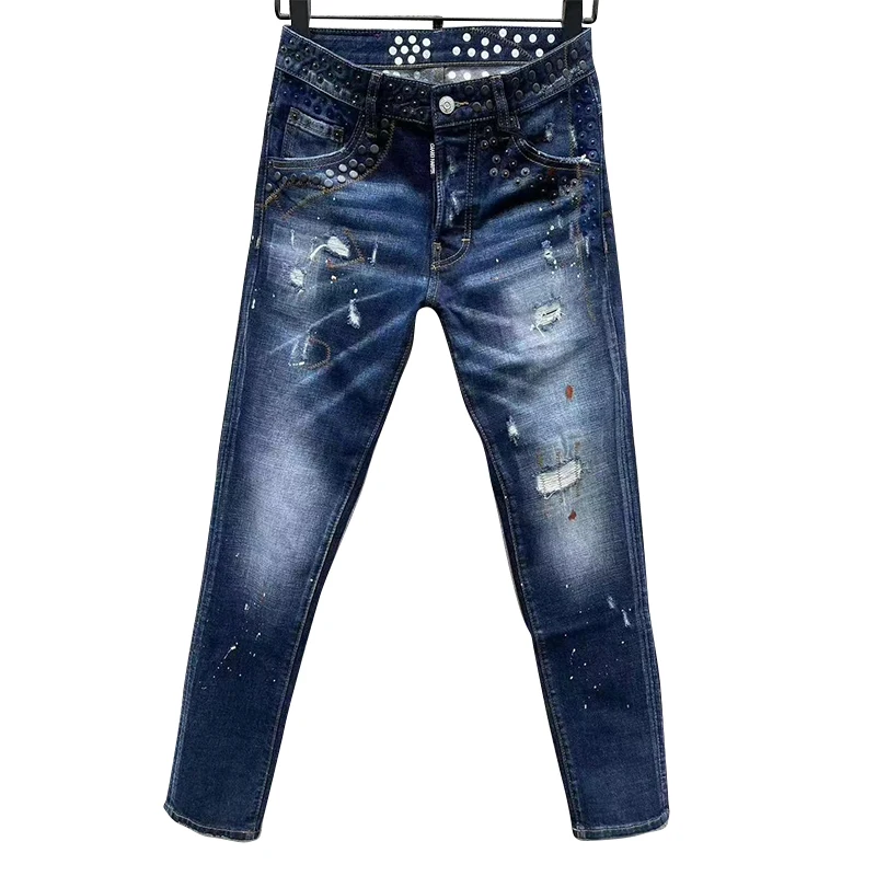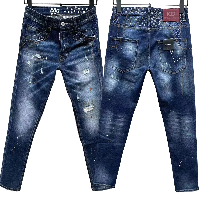100 chareiharper c060-1 Men’s small straight leg jeans ripped fabric stretch paint splash jeans