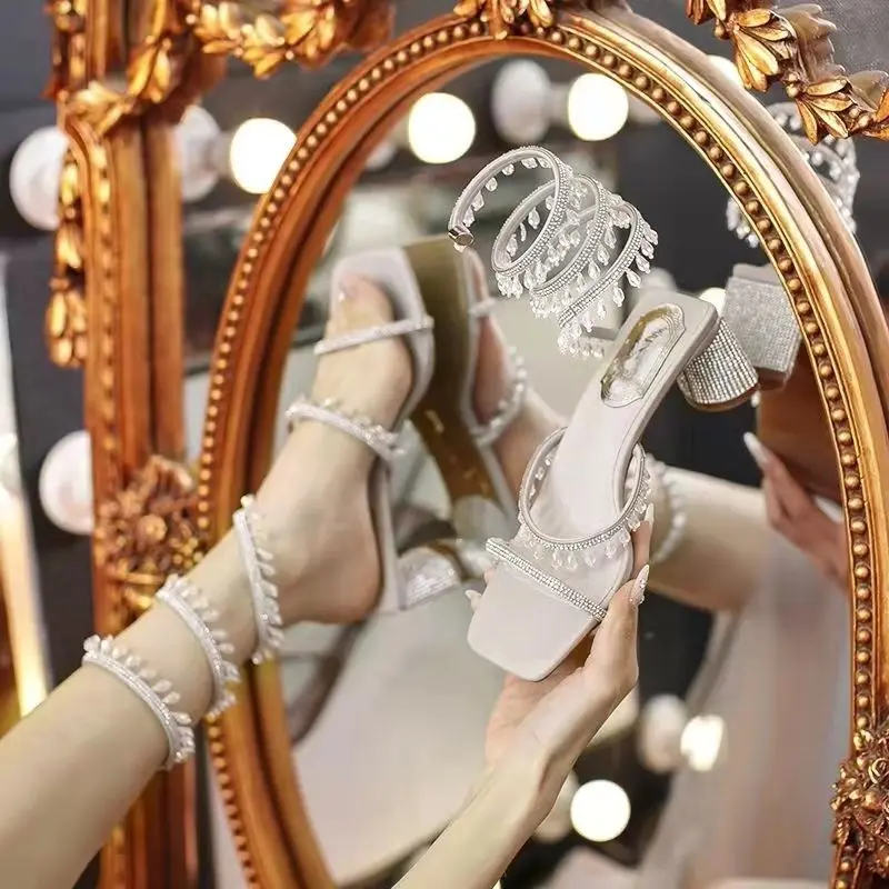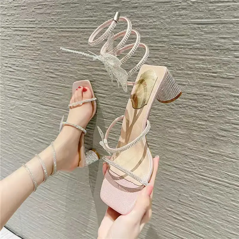 2023 Summer Fashion Luxury Rhinestone Snake Winding Butterfly Thick Heel Party Wedding Women’s Sandals