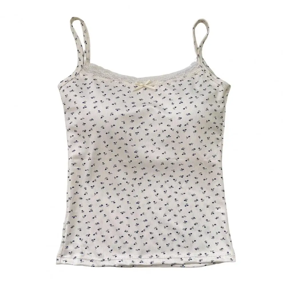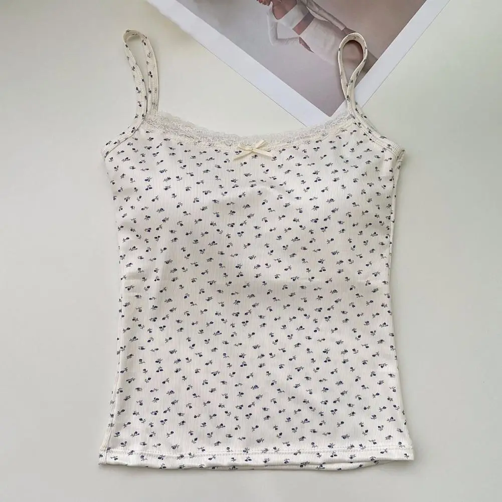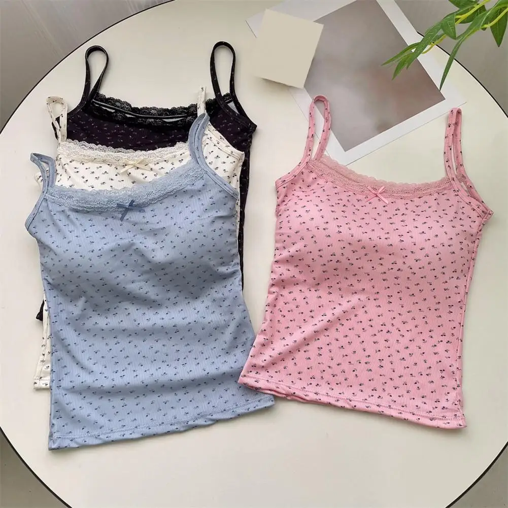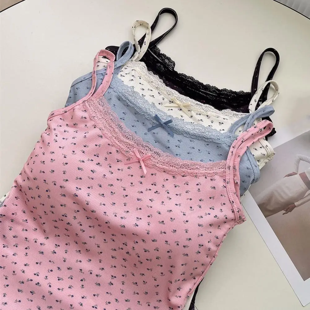 Women Padded Tank Tops Sling Printing Lace Trim Bow Decor Camisole Sexy Backless Crop Tops Slim Fit Stretchy Tops Streetwear