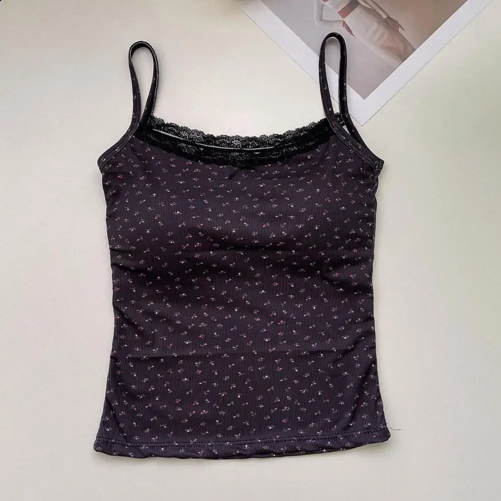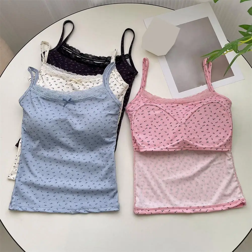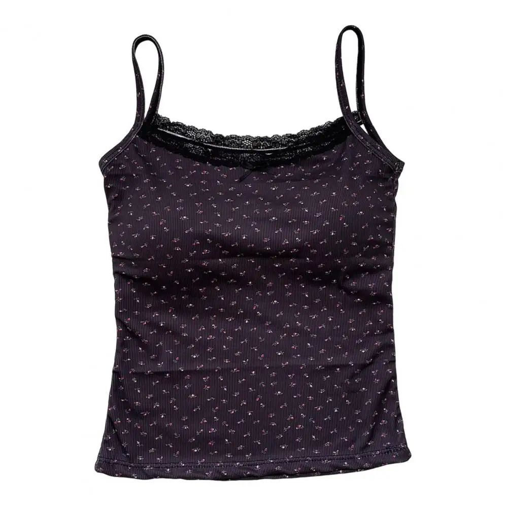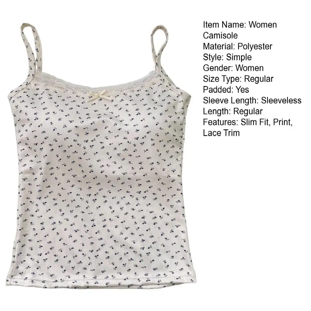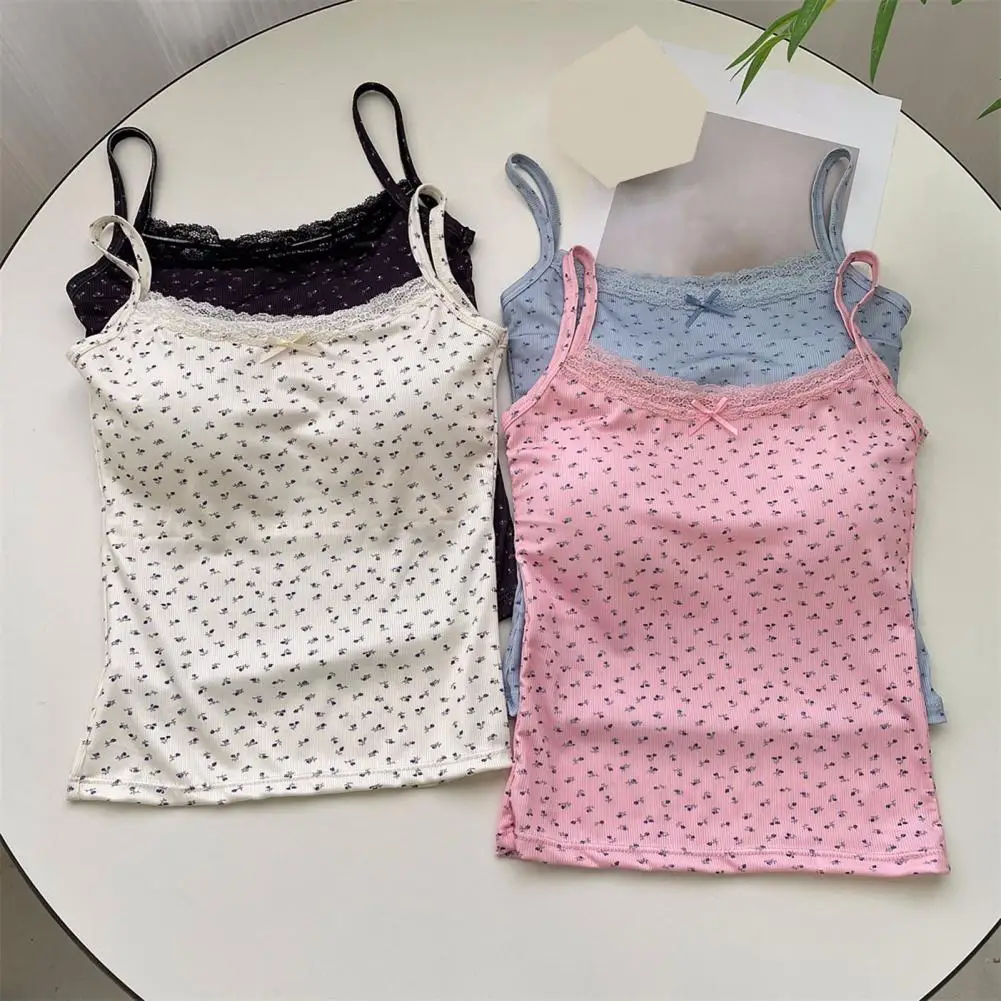 Women Padded Tank Tops Sling Printing Lace Trim Bow Decor Camisole Sexy Backless Crop Tops Slim Fit Stretchy Tops Streetwear