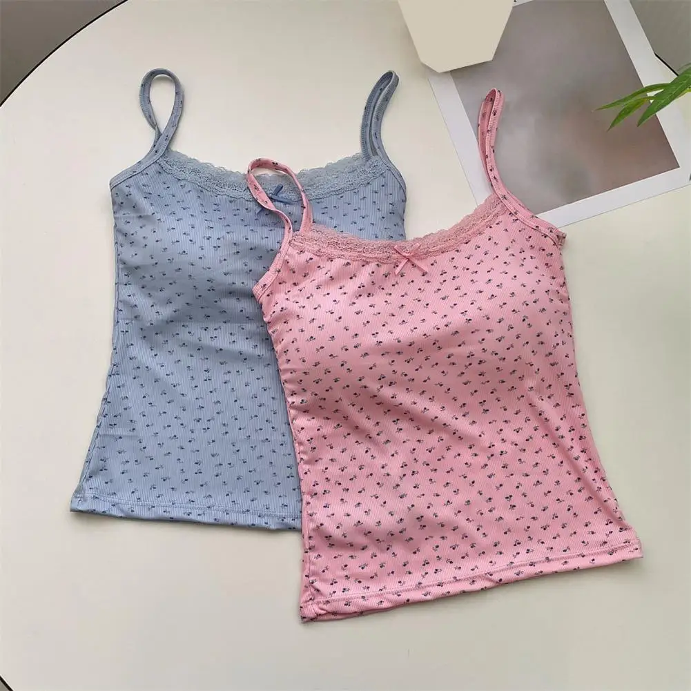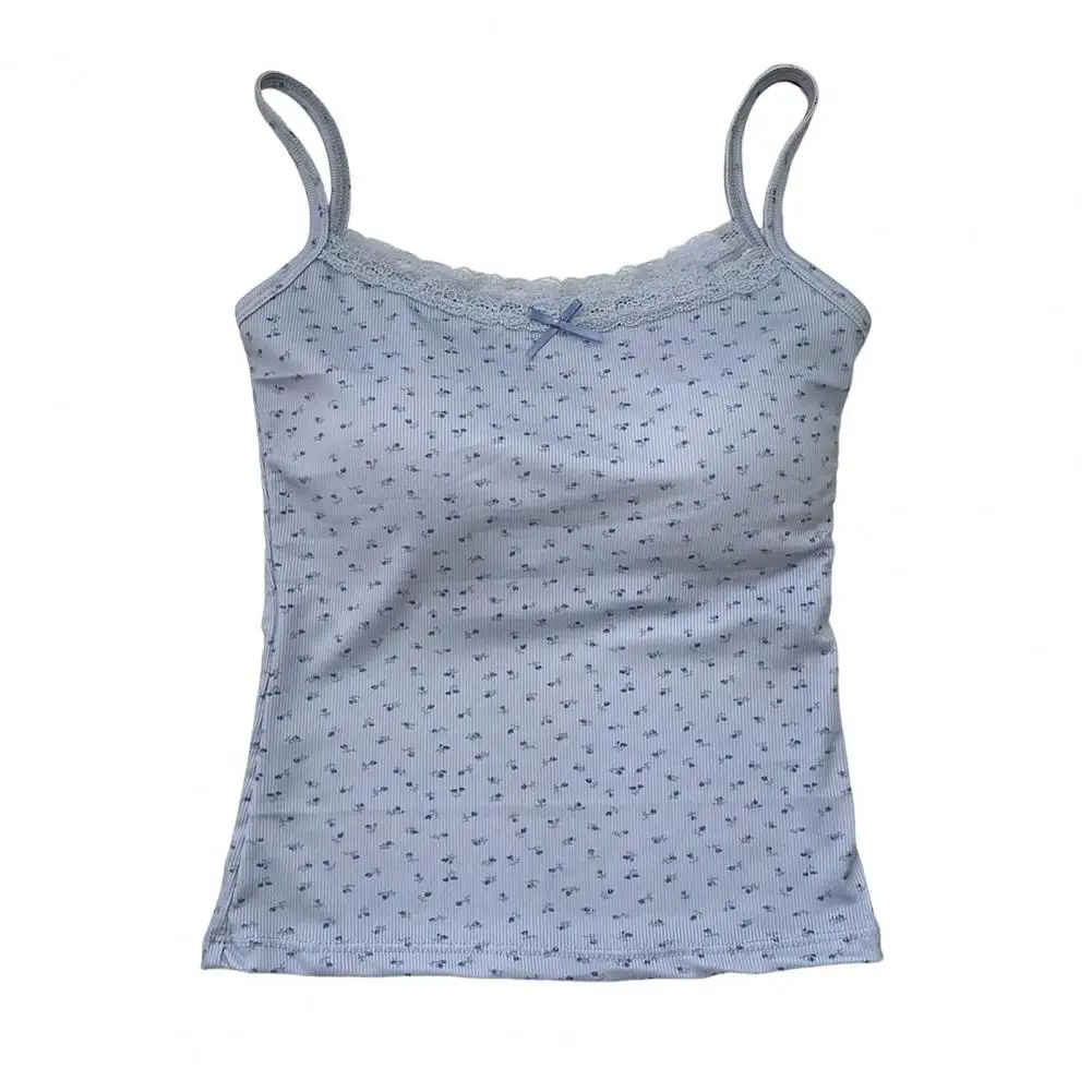 Women Padded Tank Tops Sling Printing Lace Trim Bow Decor Camisole Sexy Backless Crop Tops Slim Fit Stretchy Tops Streetwear