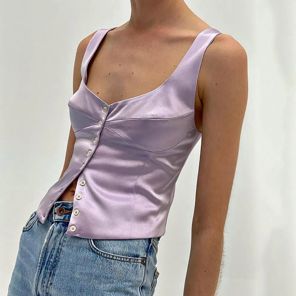 Women Summer Vest Tank Top Single Breasted Tank Top Sleeveless Backless Buttons Low-cut Elegant Crop Top Streetwear